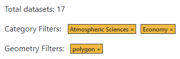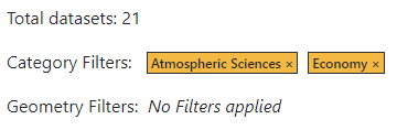 The geometry filter returns layers that correspond to the filtered geometry type (Figure 10). In the following example, we first search for layers that are in the Atmospheric Sciences or Economy categories and then we add an additional filter that filters the above layers according to their geometry type.