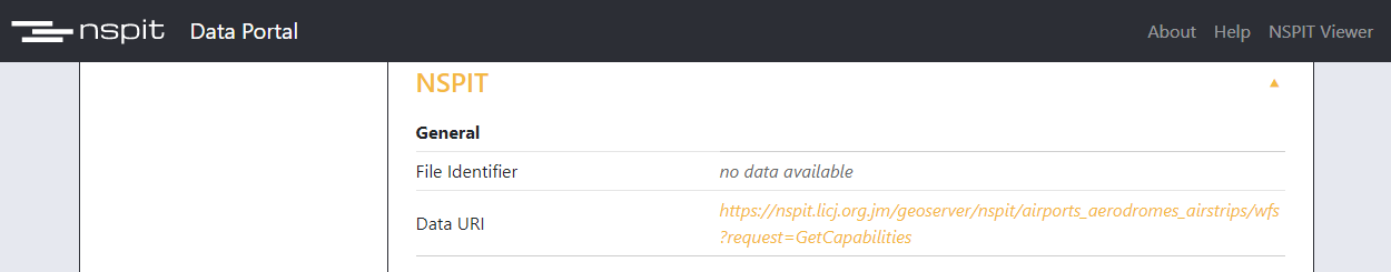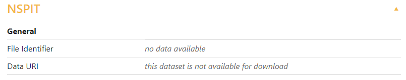 Some data from the NSPIT Portal is freely available for download. To see if a dataset is downloadable scroll to the category NSPIT (Figures 13, 14). If the dataset is downloadable there will be a WFS link under Data URI (Figure 13).