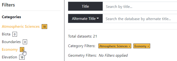 When selecting more than one category (Figure 9) you will be shown all layers that fall within either category. In the following example, all layers that are part of the Atmospheric Sciences category and all layers that are part of the Economy category are found.