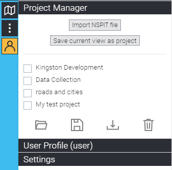 You can save projects to save a specific state of the viewer. This includes the map’s extent, zoom level, settings and activated layers. Projects are saved in your user profile.